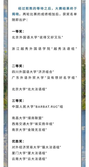 在刚刚结束的第十一届全国高校法语电影配音大赛中,我校西方语言学院法语专业学生刘俐、徐创新和段思彤三人组成的“越秀法语组”在全国60多所高校中脱颖而出,以预赛第一名的身份客场参赛。在12月6日下午举行的线上总决赛中,越秀学子与北外、北大、南大、广外、川外等十余所老牌院校选手同台竞技。比赛现场,我校学生从容不迫、随机应变,经受住了第一轮六选一环节和第二轮即兴表演环节的巨大考验,经过四个小时的激烈角逐,最终以优异的表现赢得了评委的一致赞许,与主场参赛的北京外国语大学队并列荣获一等奖。