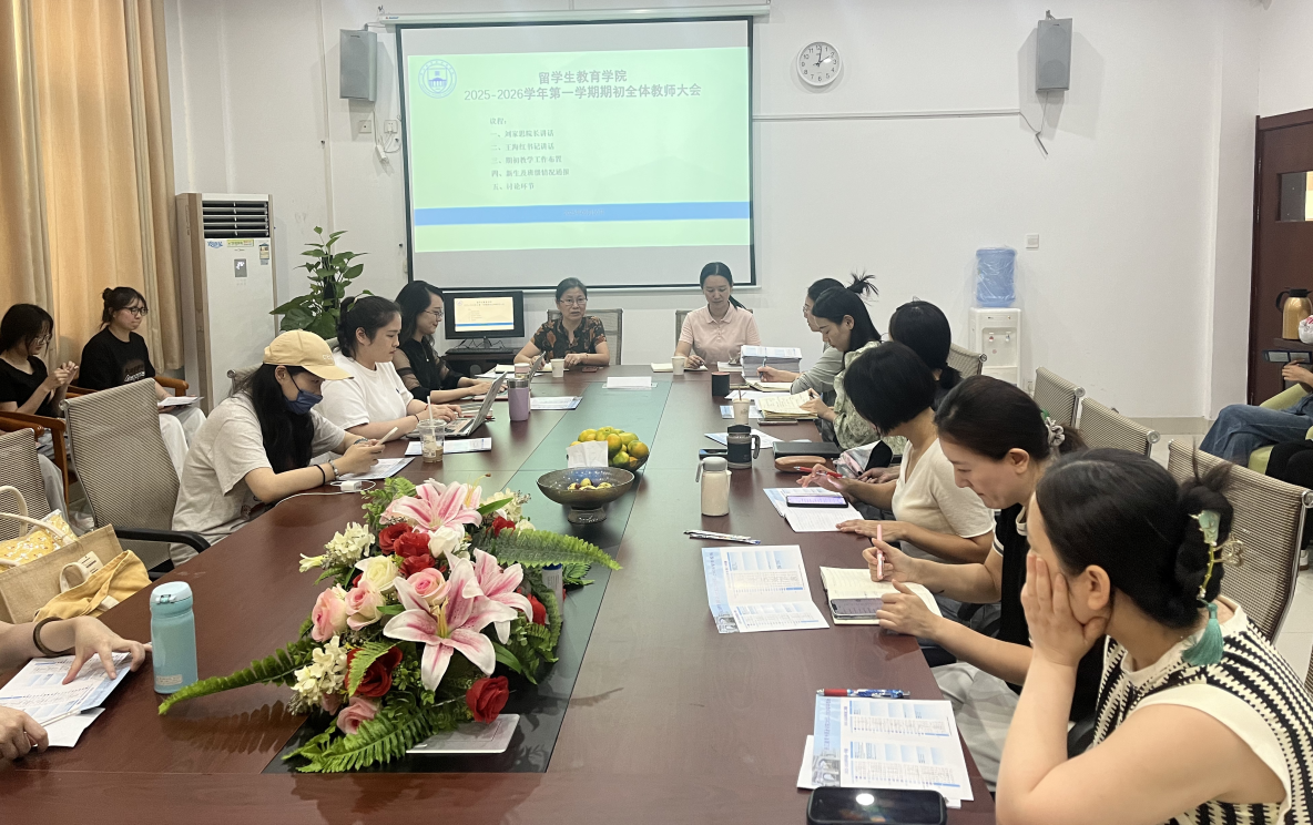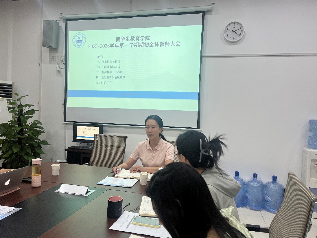 留学生教育学院于2025年9月10日下午在2-102会议室召开了新学期全体教师大会,旨在全面梳理本学期的工作,重点聚焦学院“十五五”规划的制定与高质量人才培养体系的建设。会议由王佳平副院长主持,王海红书记、学院全体教师及实习老师出席此次会议。