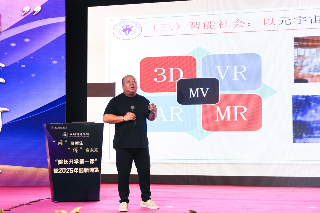 “当小概率极端事件成为常态,唯一确定的就是持续学习。”晚会伊始,何海翔院长以《未来已来:智能社会的到来—从乌卡时代走向巴尼时代》为主题,从智能社会、乌卡时代、巴尼时代三个维度展开,带领2025级新生叩响了新媒体未来世界的大门。面对当今社会人工智能发展对新闻传播领域的介入,何院长提出了“网传方案”:以技术为引擎,文化为罗盘,构建灵活响应、共享协作的组织生态,将不确定性转化为创新增量。课程的最后,何院长鼓励新生用数字思维解码世界,用人文情怀编码未来,用硬核技能与温暖叙事点亮乌卡时代的青春坐标。