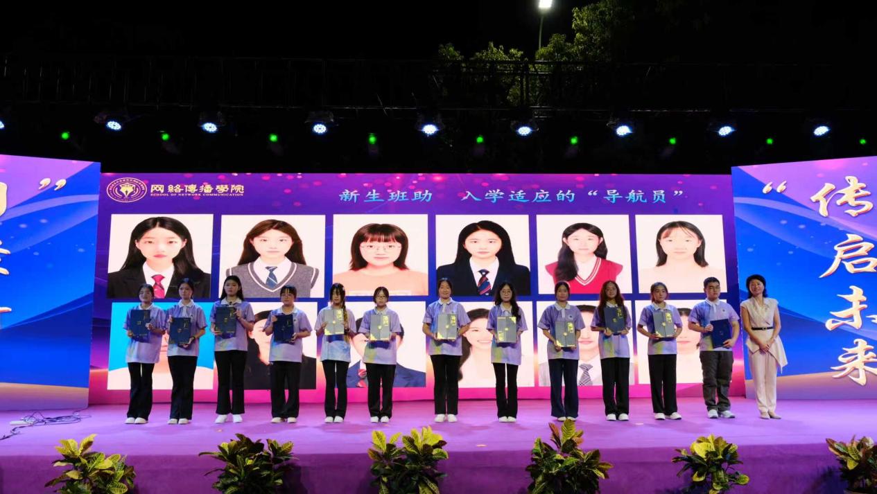 随后,庄重的聘任乐声响起,新生班主任与新生班助从学院领导们的手中接过聘书,红色烫金的字体在灯光下熠熠生辉,引路星火自此传递。新生班助与优秀校友代表王哲伦学长合唱《网传之歌》,“践行新闻传播的使命,弘扬新媒体人才志气”的责任担当随着旋律刻进每个人的心跳里,大家收获了属于“网传人”的共同记忆。