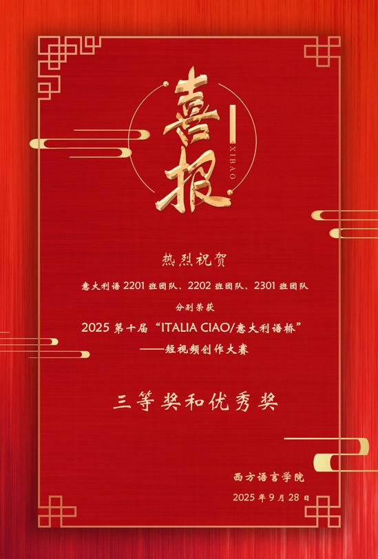 此次比赛成果充分彰显了我校意大利语专业学生优秀的语言应用能力、跨文化理解力与创新表达能力,也是西方语言学院持续推进专业教学与实践融合、注重学生综合素质培养的生动体现。期盼同学们以此为励,在今后的学习与竞赛中不断突破自我,再创佳绩!