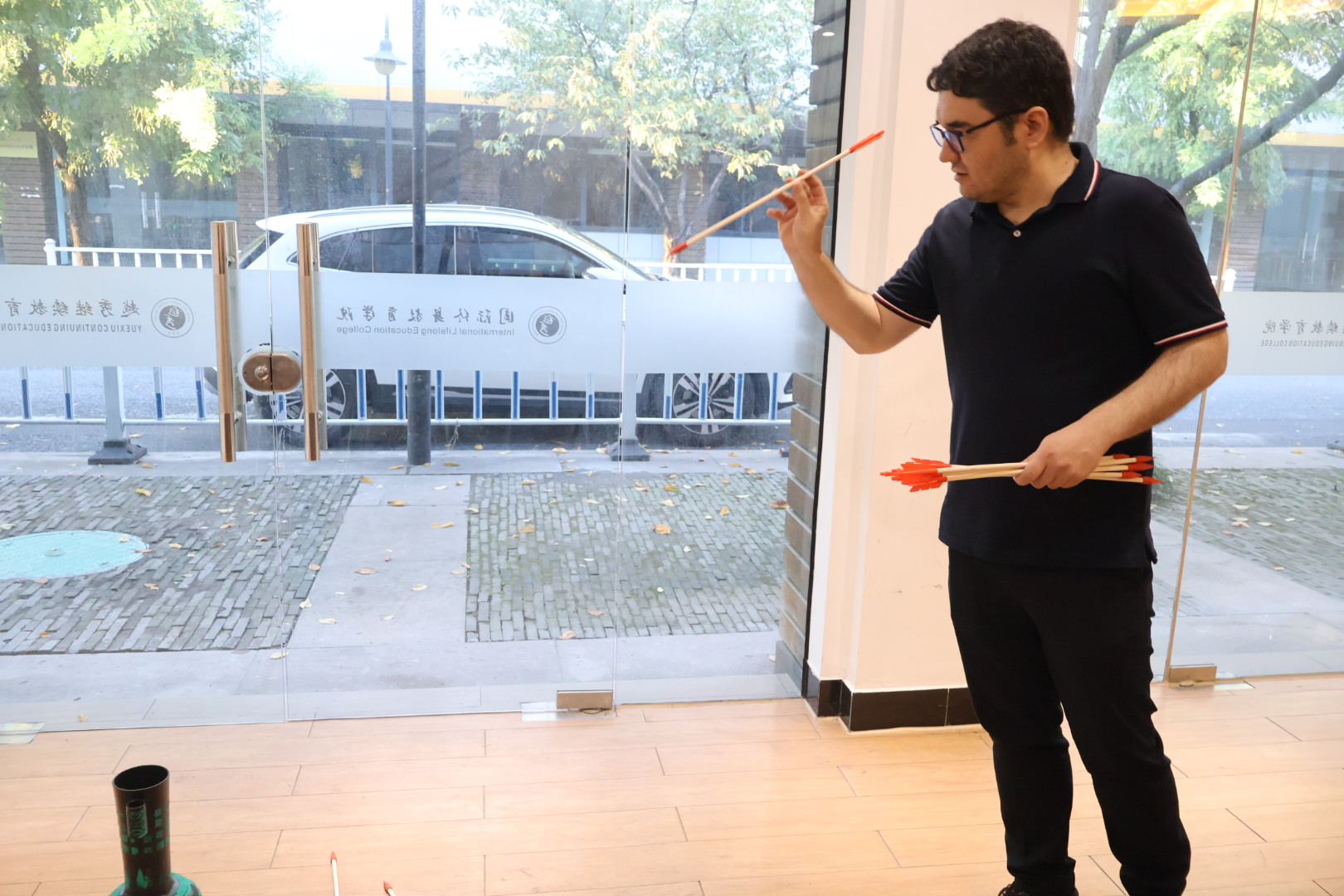 最后的投壶游戏将活动氛围推向高潮。外教们通过助理的讲解了解投壶的历史渊源与游戏规则,大家听得津津有味,跃跃欲试。尽管瞄准投箭颇具难度,初次尝试的外教们却兴致盎然,纷纷排队挑战。每当有箭矢精准入壶,现场便爆发出阵阵欢呼;即便失之交臂,也会收获同伴们鼓励的掌声。大家在一次次尝试中感受着中国传统游戏的独特乐趣。