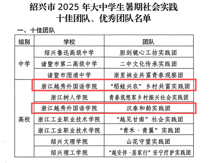 为深入学习贯彻党的二十大精神和习近平总书记对学校思政课建设的重要指示精神,进一步引导越秀青年学子走出校园、深入社会,上好社会实践“大思政课”,2024-2025学年暑假,校团委全面贯彻党的教育方针,紧密围绕立德树人根本任务,全面启动学生暑期社会实践活动。来自11个学院的近百支实践团队,奔赴全国各地,深入基层一线,以脚步丈量祖国大地,开展教育帮扶、乡村振兴、生态保护等多个领域的社会实践,在广袤的神州大地上用青春热血践行“和成育秀”的校训,以实际行动书写“青春为中国式现代化挺膺担当”的答卷。近日,在共青团绍兴市委组织的2025年绍兴市大中学生暑期社会实践路演评比中,我校两支实践团队脱颖而出并斩获佳绩,这不仅是对学子们能力的高度肯定,更彰显了我校育人目标的有效达成。