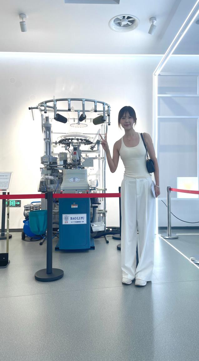 (学生在全自动智能织缝翻一体袜机前拍照留恋)