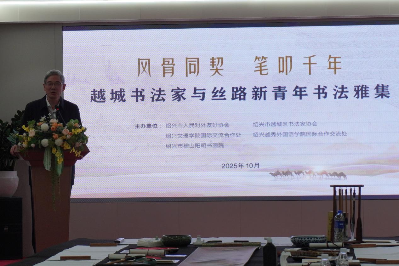 10月25日下午,由绍兴市人民对外友好协会、绍兴市越城区书法家协会等机构主办的“风骨同契 笔叩千年——越城书法家与丝路新青年书法雅集”活动在新中友好文化艺术交流中心举行。出席本次活动的领导和嘉宾有绍兴市越城区人大主任、友协会长徐荻,绍兴市越城区书法家协会主席王志刚及越城区多位书法名家。我校来自哈萨克斯坦、意大利、印度等多个国家的三十余名外教参加本次活动,活动由绍兴市人民对外友好协会副会长曾险主持。
