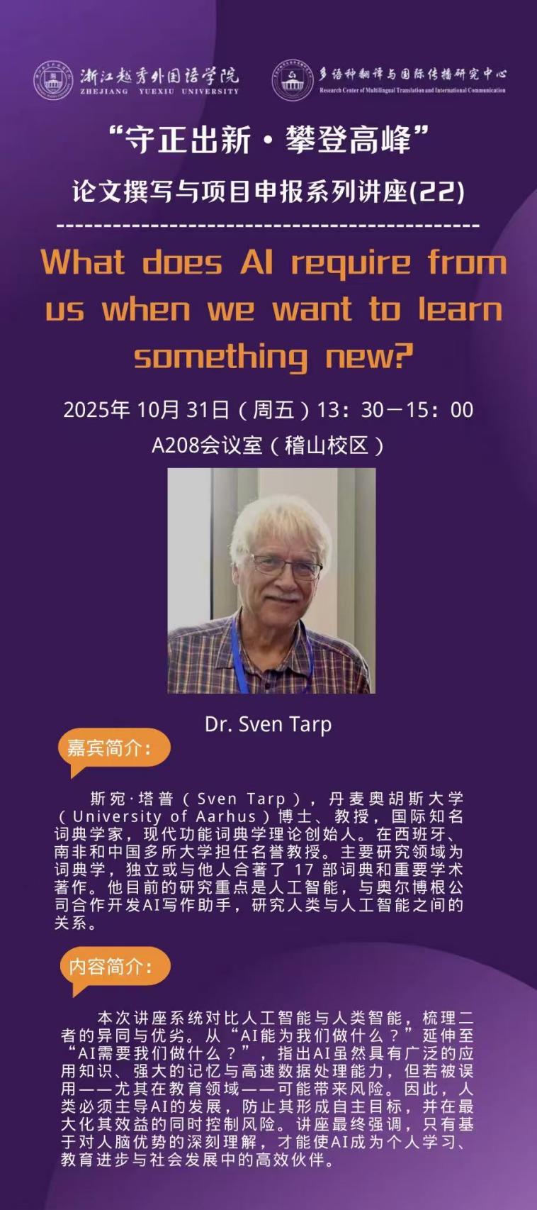 2025年10月31日,丹麦奥胡斯大学(University of Aarhus)教授、国际知名词典学家、现代功能词典学理论创始人斯宛·塔普(Sven Tarp)应邀来浙江越秀外国语学院,以“What does AI require from us”(AI要求我们做什么)为题,为英语学院师生深度解析人工智能时代人机协作的核心逻辑与人类的独特价值。讲座由英语学院教师周成龙博士主持。