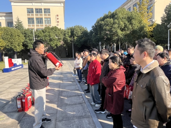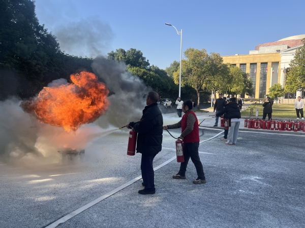 在灭火演练环节,保卫部老师现场演示了灭火器“提、拔、握、压”四字使用诀窍,并讲解了火灾应对要点。在专业人员的指导下,师生和外来经营户们轮番上阵,手持灭火器对准火源进行扑救,通过实操掌握了初期火灾的处置技能。