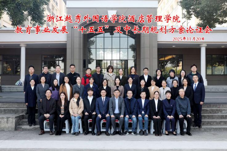 2025年11月20日,浙江越秀外国语学院酒店管理学院教育事业发展“十五五”规划和2035年中长期规划论证会在学校新和成讲堂如期召开。会议由酒店管理学院院长尚云峰主持。参加本次论证会的专家主要有绍兴市文化广电旅游局市场管理处处长金伟锋、浙江省饭店业协会副会长暨绍兴市饭店业协会会长应明、杭州国际会议中心洲际酒店驻店经理张友勇、绍兴富悦温德姆酒店总经理宣登峰、杭州西湖国宾馆人力资源部经理翟华、酒店管理学院会展经济与管理专业原学科带头人丁萍萍等。酒店管理学院党政班子成员及全体教师都到会参加了研讨。