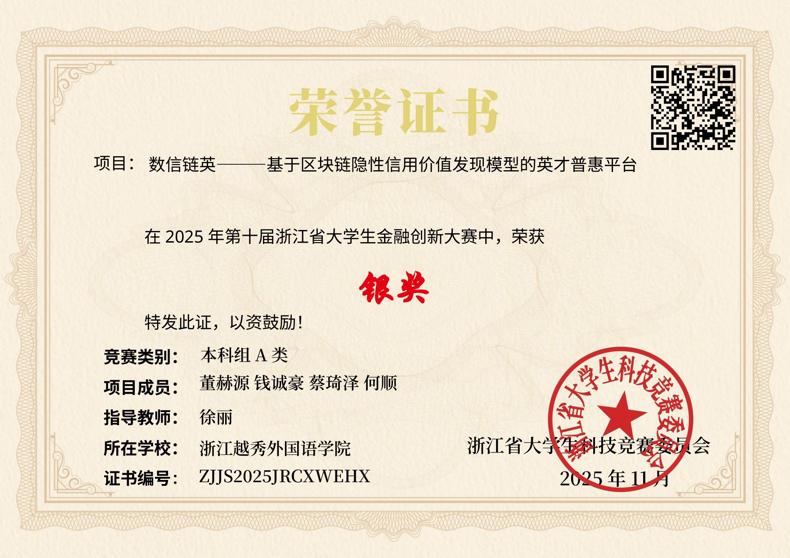 2025年第十届浙江省大学生金融创新大赛获奖结果近日揭晓,我院学生团队凭借项目 《数信链英——基于区块链隐性信用价值发现模型的英才普惠平台》 荣获本科组A类银奖。