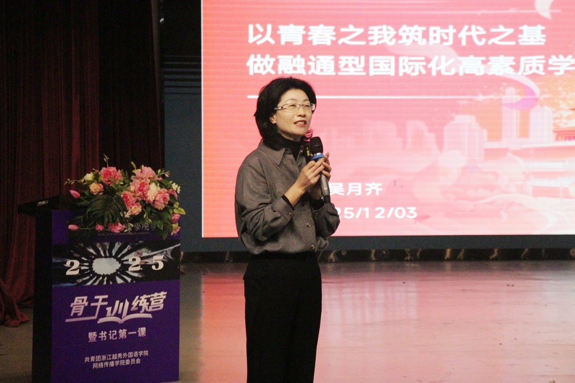 12月3日下午,网络传播学院2025-2026学年学生骨干训练营在镜湖剧院开营。学院党委书记吴月齐教授以《以青春之我筑时代之基——做融通型国际化高素质学生骨干》讲授“书记第一课”,党委副书记葛丹丹、学工办老师及全体学生骨干参会。