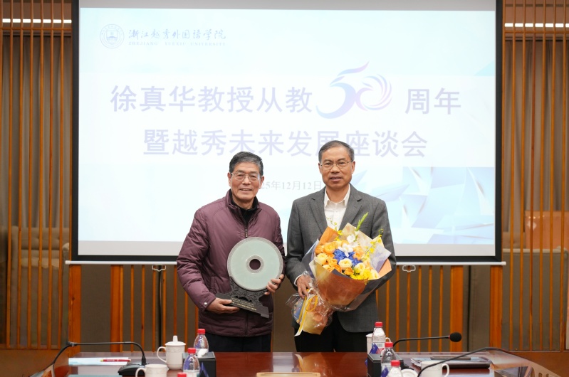 12月12日下午,浙江越秀外国语学院镜湖校区图书馆学术交流空间群贤毕至、暖意融融,“徐真华教授从教50周年暨越秀未来发展座谈会”顺利举行。本次活动由广东外语外贸大学、浙江越秀外国语学院、广东省人民政府文史研究馆联合主办。座谈会以“治学、治校、育人”为主线,与会嘉宾回顾徐真华教授50年教育生涯的坚守与成就,分享其教育思想,并探讨新形势下外语教学和民办高校发展态势。