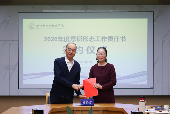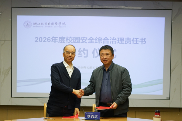 费君清教授代表学校与各二级学院、职能部门负责人签订了《2026年平安校园建设暨校园治安综合治理责任书》《2026年意识形态工作责任书》。