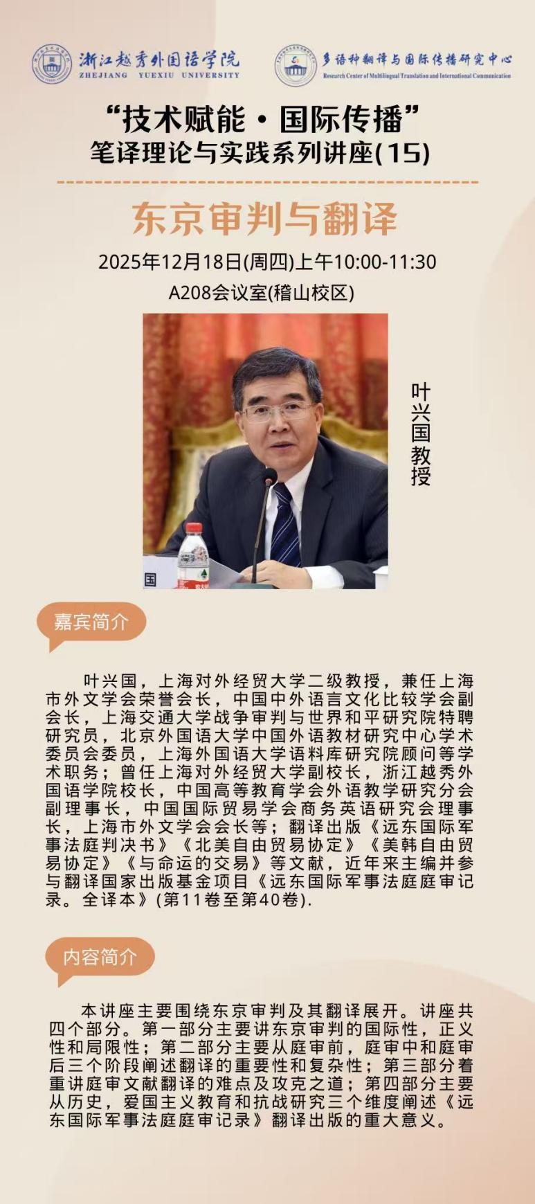 2025年12月18日上午,应学校邀请,浙江越秀外国语学院前校长、上海对外经贸大学叶兴国教授回到英语学院为教师作题为“东京审判与翻译”的专题讲座,深度解读东京审判的历史价值与翻译工作的核心意义。讲座由英语学院院长王建香教授主持,吸引各学院教师踊跃参加,现场座无虚席。
