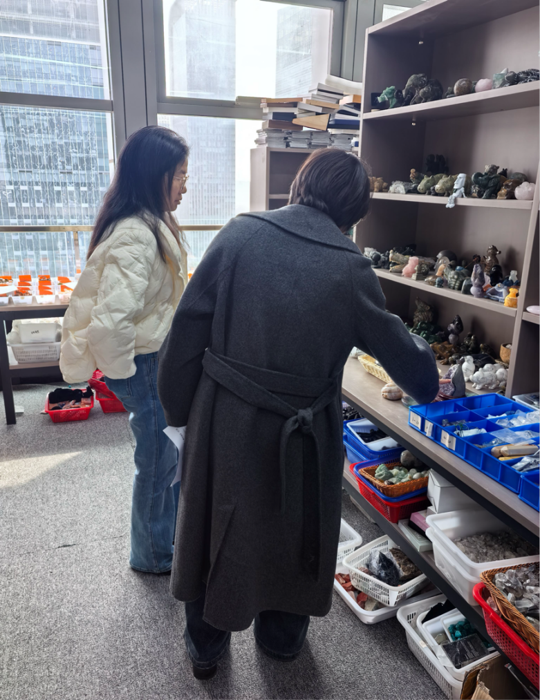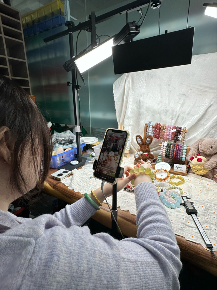 对于完全没有直播经验的老师们来说,这是一个不小的挑战。面对镜头、面对可能“冷场”的实时流量,还要用英语介绍产品——从水晶的材质、色泽,到它所承载的“能量寓意”和搭配建议。