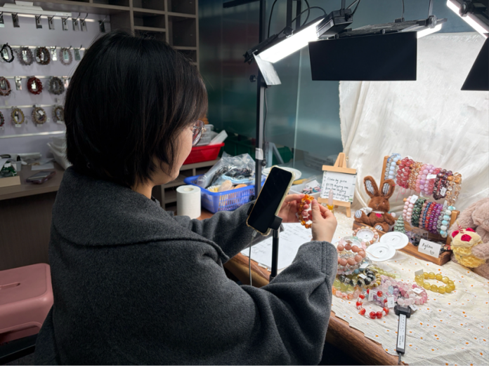 学习进入最后一天,企业方为四位老师布置了一份特别的“结业作业”——轮流进入公司真实的TikTok直播间,每人进行一小时的英文直播,独立完成水晶手链产品的展示、讲解与互动。