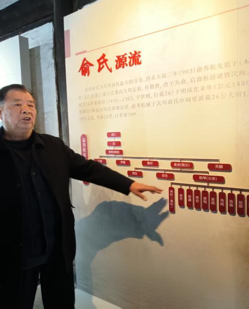 (77岁的俞治华老人在讲解家族故事)