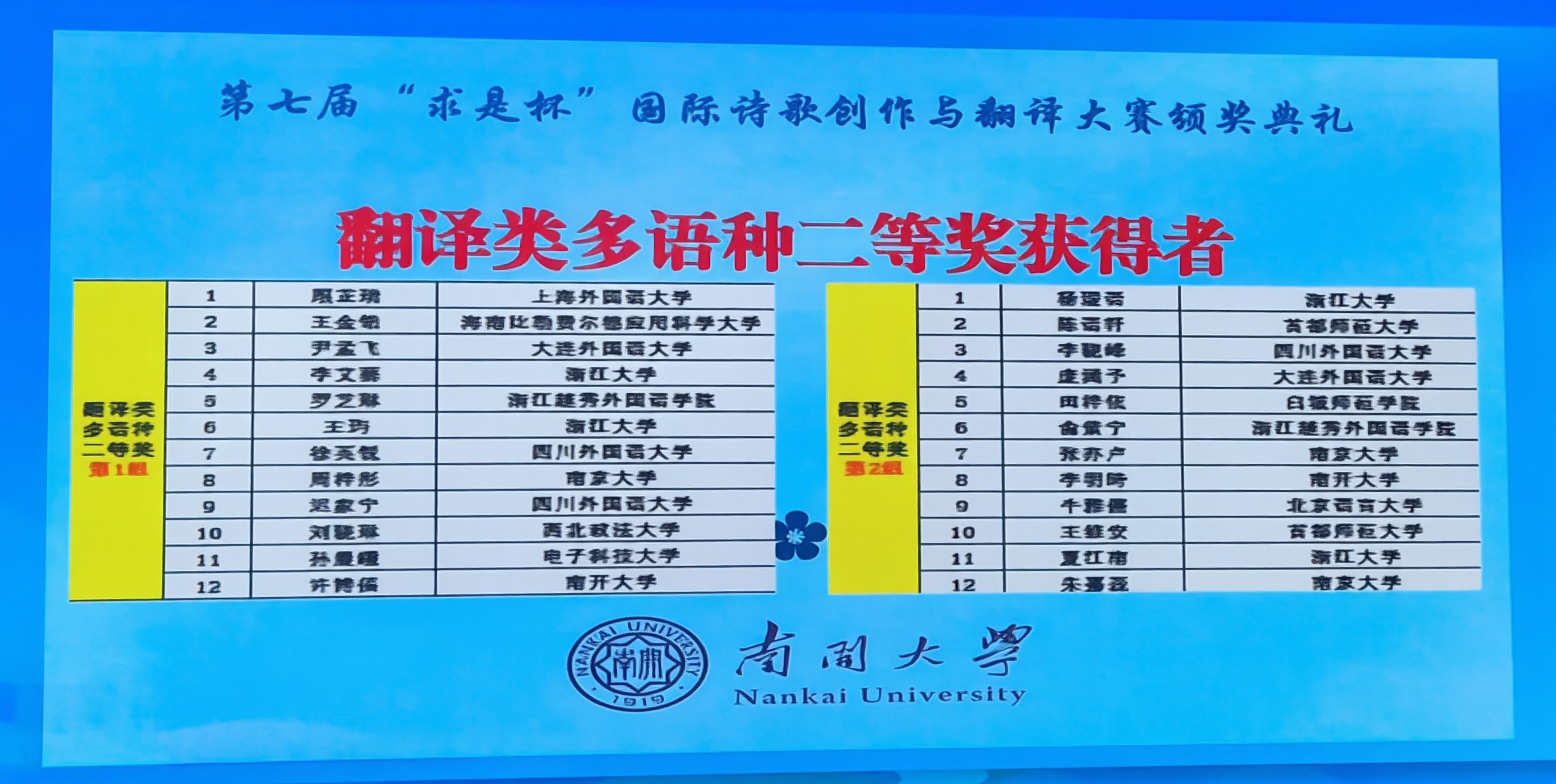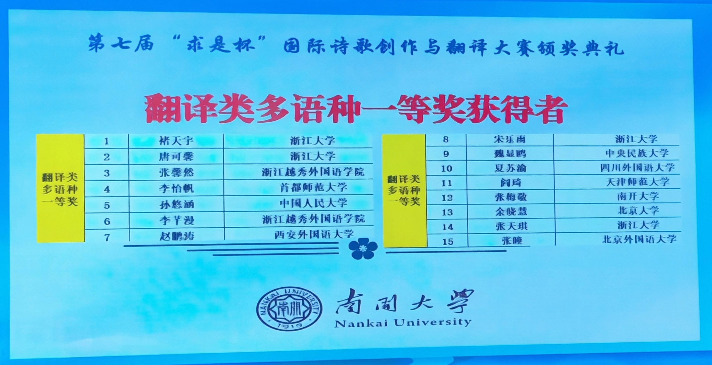 日前,第七届“求是杯”国际诗歌创作与翻译大赛决赛于3月28日至29日在南开大学落下帷幕。西方语言学院德语系张馨然、法语系李芊漫双双荣获翻译类多语种一等奖,俄语系罗芝琳荣获翻译类多语种二等奖。