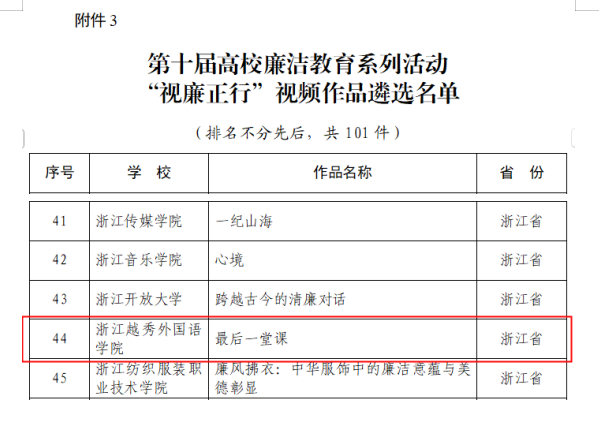 教育部高校廉洁教育系列活动优秀作品评选,是面向全国高校廉洁文化创作与教育成果的高规格展示平台,由教育部思想政治工作司主办。经各高校选拔申报、各省教育厅审核推荐及教育部评审后确定最终入选名单,目前已举办十届。本届入选作品共分七大类,其中视频类共遴选出优秀作品101件,浙江省入选5件,我校为浙江省民办高校中唯一获奖单位。