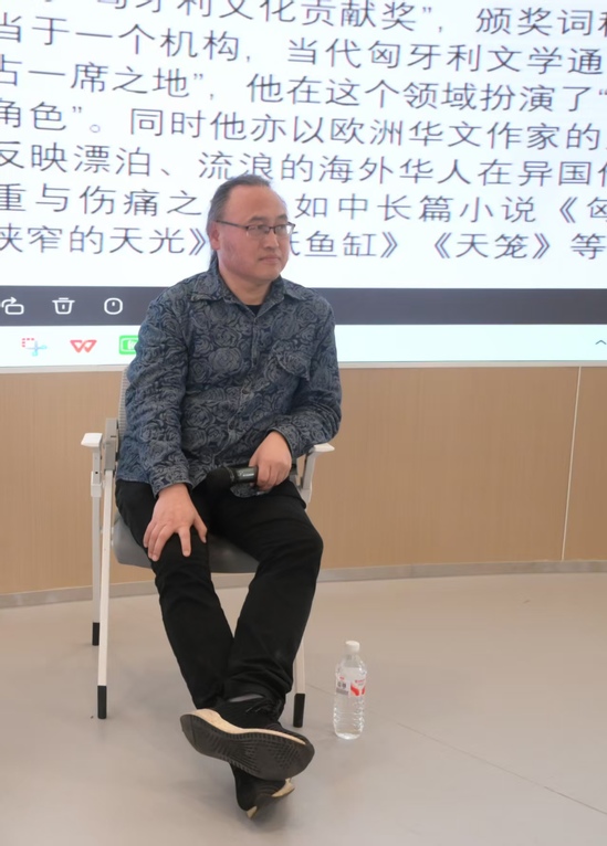 互动环节中,师生围绕旅行创作灵感、拉斯洛《反抗的忧郁》叙事特色等问题踊跃提问,余泽民教授对其逐一细致解答。他分享从欧洲的文人咖啡馆、名人墓地、各地教堂中汲取创作灵感的经历;解读《反抗的忧郁》无单一主角的叙事模式,正是为诠释人类发展从困境到困境的闭环逻辑服务。现场交流氛围热烈,师生均表示收获颇丰。