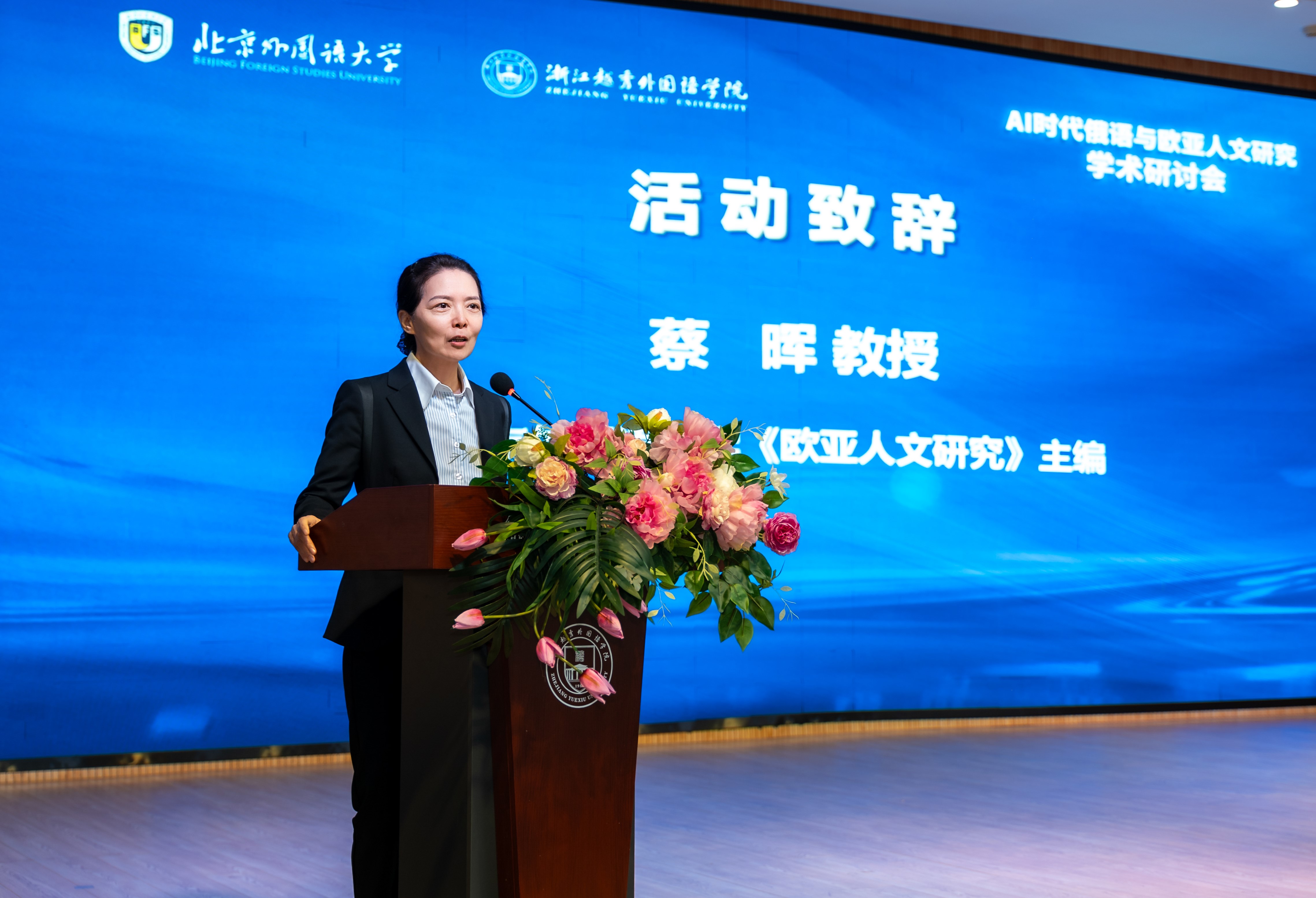 在大会开幕式上,北京外国语大学副校长赵刚教授、浙江越秀外国语学院常务副校长郭杰教授、北京外国语大学《欧亚人文研究》主编蔡晖教授先后致辞。开幕式由浙江越秀外国语学院西方语言学院院长龚茜教授主持。