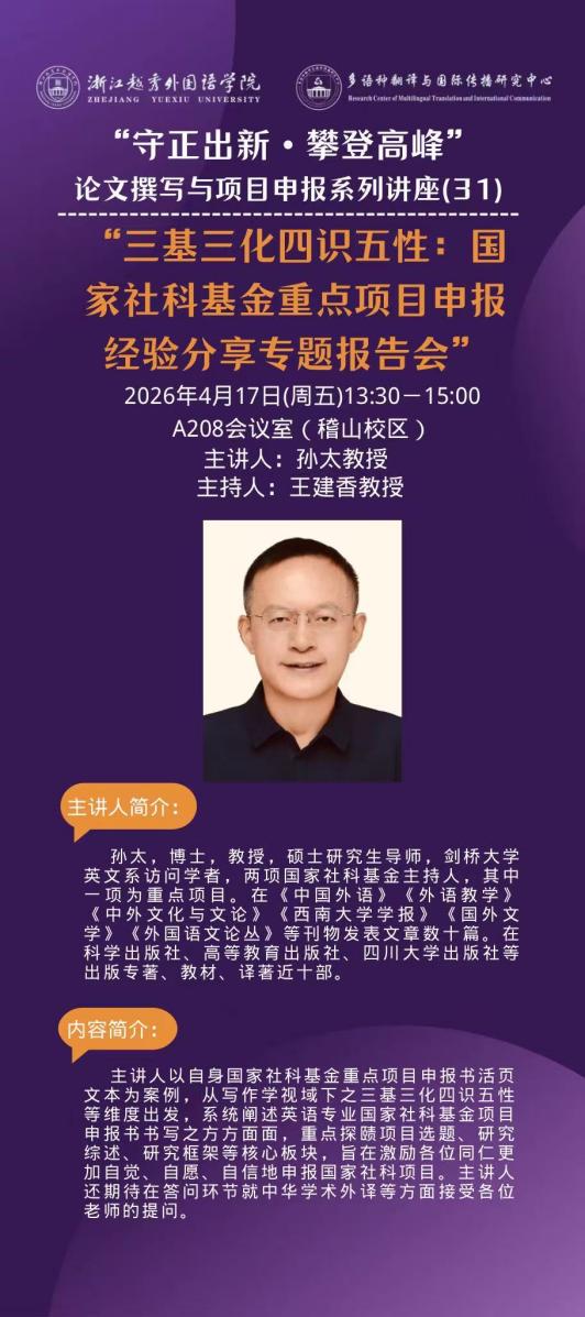 2026年4月17日下午,浙江越秀外国语学院英语学院特邀孙太教授,为英语学院教师举行“三基三化四识五性:国家社科基金重点项目申报经验分享专题报告会”。报告会由英语学院院长王建香教授主持,吸引了30余位老师参加,现场反响热烈。