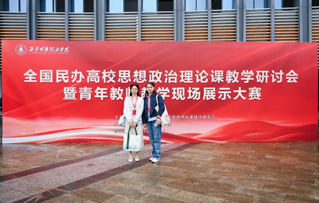 为深入贯彻落实立德树人根本任务,持续提升思想政治理论课教学质量,加强思政课青年教师队伍建设,马克思主义学院史丽琴副院长带领青年教师屠逸钿于9月20-21日赴西安参加由全国民办高校思想政治理论课建设研究会主办、西安明德理工学院承办的“全国民办高校思想政治理论课教学研讨会暨青年教师教学展示大赛”,屠逸钿教师在“青年教师教学展示大赛”中荣获二等奖。充分准备,成功入围本次比赛面向全国民办高校思想政治理论课专职青年教师,以现行高校思想政治理论课教材为依据,选取教学内容进行教学设计与教学展示。接到通知后,在马克思主义学院赵海峰院长、史丽琴副院长等教师的指导下,屠逸钿教师认真学习习近平总书记关于教育的重要论述,结合在浙江越秀外国语学院教学和比赛的经验,以“深入推进大中小学思想政治教育一体化建设”为切入点,开始准备参赛的资料。8月下旬,屠逸钿教师线上提交了参赛视频,经由全国民办高校思想政治理论课建设研究会组织专家进行线上评审,从全国65所民办高校165位参赛教师中成功入围线下现场教学展示环节。奔赴西安,交流学习在收到入围通知后,赵海峰院长大力支持史丽琴副院长带领屠逸钿教师赴西安比赛学习,总结参赛经验,
