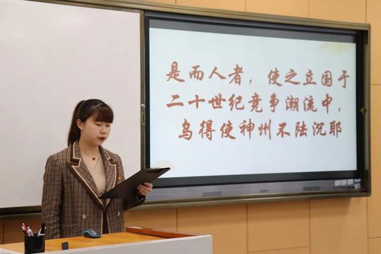 日语2001班的符曼芳同学以“甘当党的绿叶,方成大国之光辉”为主题,讴歌了一个“屈当绿叶,无私奉献”的时代楷模周总理,赞颂了一个“以己之力,为天地立心,为生民立命”的周总理,指引和激励着在场的每一个人。