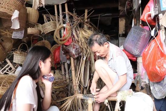 自古有云,大隐隐于市。实践团成员用时三天在乡间小镇中走访了数位民间竹编手工艺人并拜访了一位七十六岁一直以竹编为生的民间匠人楼金木。在楼爷爷店前可以看见各式各样的竹编产品,他亲切地向实践团详细介绍了自己日常编织竹编产品的工序(从破篾、染色、编织、到装提手等)。楼爷爷坦言自己对于20年来没有青年一代愿意学习和传承竹编手艺的现状感到些许无奈和担忧。楼爷爷用自己的一辈子执着地做一件事,这是一种几十年如一日的坚持,是对竹编手艺传承的坚守和心血,老一辈竹编匠人的工匠精神值得我们学习。