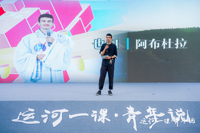本次宣讲展示活动分为三个篇章。阿布杜拉,在本次活动的第二篇章“乘风·开放”中迎来了属于自己的闪光时刻。在代表着青春活力的《运河号手》街舞表演结束后,阿布杜拉作为一名独特的国际青年宣讲员登台,并以《观前千运河 颂追梦华章》为主题,开始讲述他与绍兴,与运河的别样故事。