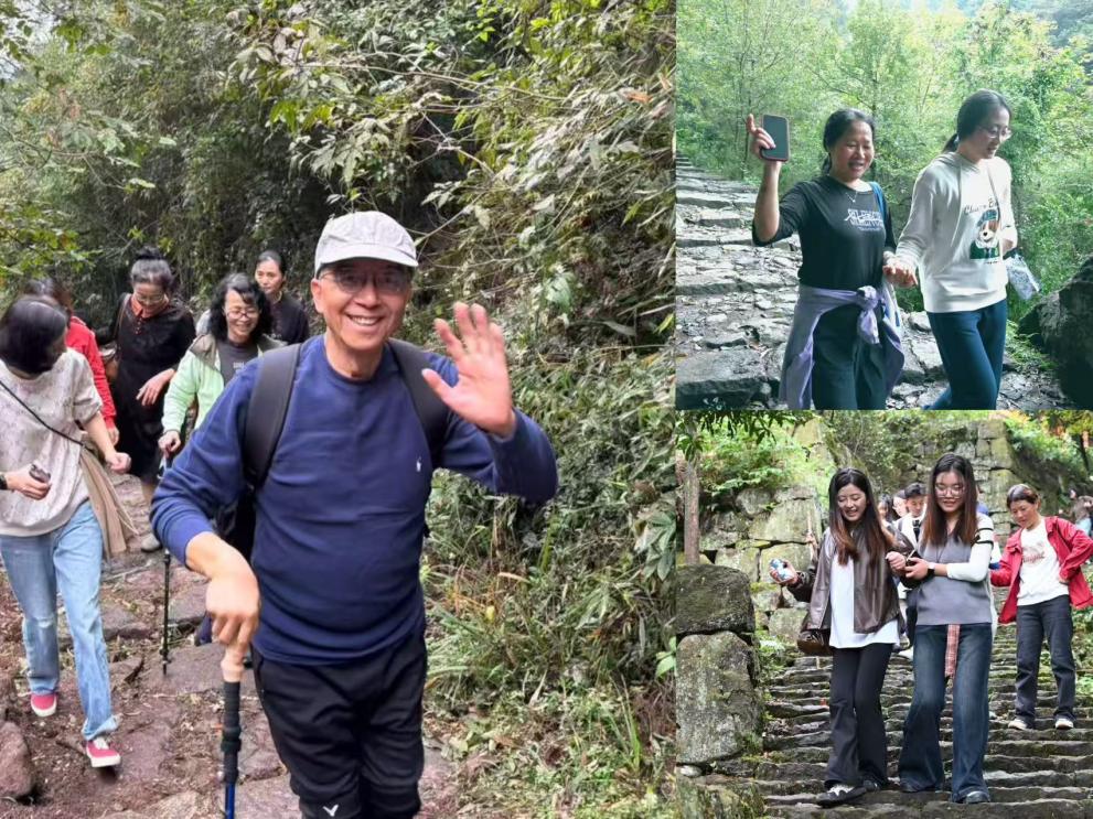 活动当日,受前期降雨影响,陶宴岭古道的石阶表面仍有湿滑,给登山行程增添了几分挑战。老师们结伴而行、相互鼓劲。大家沿着"金渔村——岭登——金渔村"的路线稳步前行,时而驻足欣赏沿途田园里的新鲜蔬菜,时而俯身观察溪水清澈、小鱼欢游的生态之美,时而畅谈工作生活点滴,在欢声笑语中缓解了工作压力。遇到陡峭路段,年长的老师耐心引路,年轻的老师主动帮扶,彼此的关怀与鼓励化作前行的动力,让蜿蜒的古道上涌动着温暖的暖流。