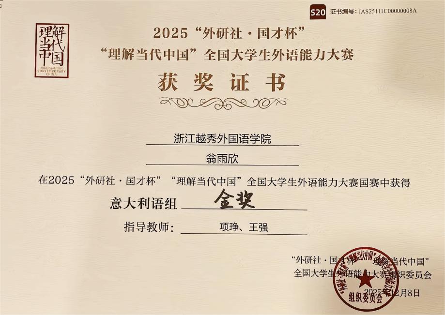 国赛金奖 | 多语种 (意大利语) | 西语学院 | 翁雨欣 | 项铮、王强 |