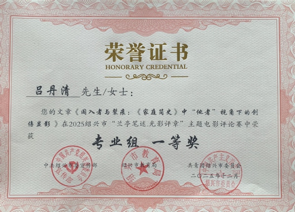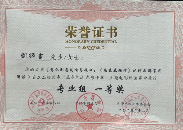 近日,在中共绍兴市委宣传部、市教育局、团市委联合主办的2025“兰亭笔述·光影评章”全市大学生影评大赛中,我校中文学院学子以锐利的学术视角与深厚的文字功底再拔头筹——共获专业组一等奖2 项(全市仅3 项)、二等奖4项、三等奖5项,占全市获奖总数50 % 以上,实现历史性突破。