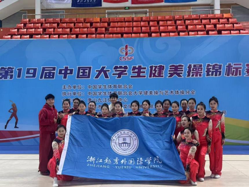 为塑造健康体育项目文化氛围,彰显越秀学子健身美体风采;同时响应学校“十五五”和中长期规划中学科竞赛工作要求。依照《中国学生体育联合会关于印发2025年竞赛计划的通知》(学体联[2025]4号),派遣了由体育部主任张岚教授为领队,钟洋洋老师为主教练的浙越外健美操队,参加了12月16日~21日期间在河北省迁安市唐山九江体育中心体育馆举办的第19届中国大学生健美操锦标赛。最终在全国六十九所高校暨近千余名运动员中通过团队通力协作顽强拼搏,斩获1金4银1铜1殿的优异成绩。