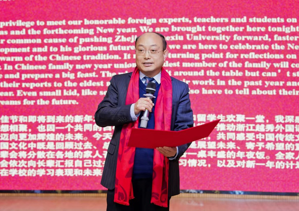 雍和明向全体外籍师生致以诚挚的新年问候和美好祝福,并对他们一年来为学校做出的贡献表示衷心感谢。雍和明指出,我校外籍师生为我校课堂教学带来了独特的视角,为校园生活增添了多彩的文化元素,为学校发展注入了宝贵的国际活力,已成为越秀大家庭中不可或缺的重要成员,使学校变得更加包容、开放、生动。他强调,浙江越秀外国语学院是一片追逐学术理想的热土,是多元文化交汇的舞台,学校始终致力于打造一个开放包容的国际化学习共同体,为每一位国际师生追逐梦想提供坚实的支持。他希望中外师生能继续加强交流与互动,加深彼此的理解,为未来国家间的合作与友谊奠定基础。