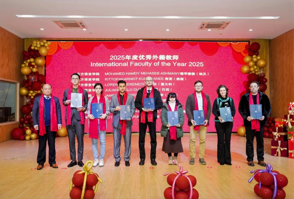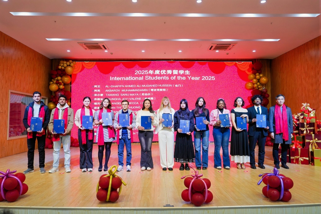 在颁奖环节,雍和明为英国外教詹姆斯等8位外籍教师颁发“2025年度优秀外籍教师”证书,罗继红为尼泊尔留学生宋小爱等12位留学生颁发“2025年度优秀留学生”证书。