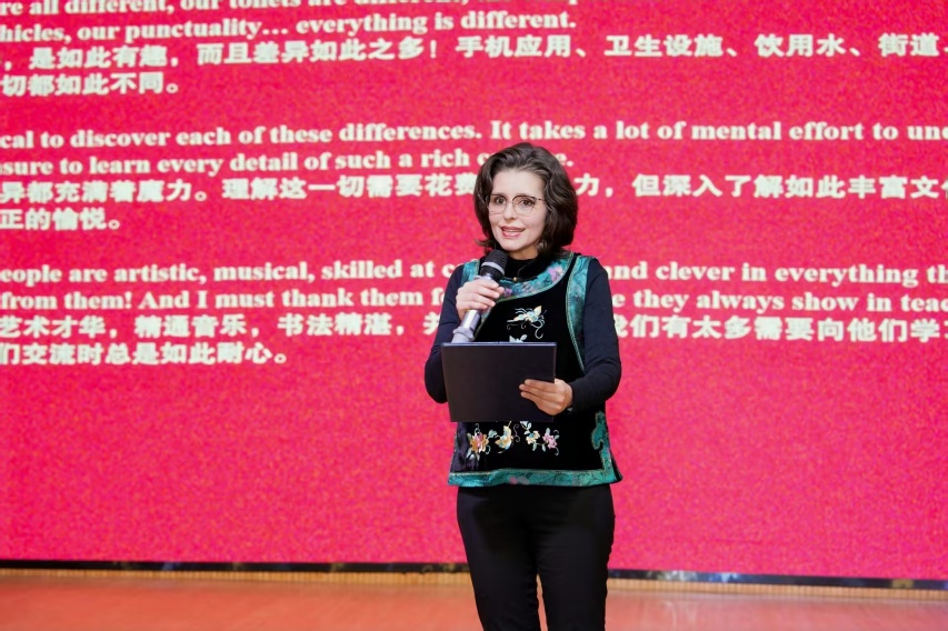 来自巴西的外教杜鹃作为外教代表发言,她讲述了自己在中国工作生活的感悟,也分享了在手机应用、卫生设施、交通工具、时间观念等方面的文化碰撞所引发的趣事。她由衷感叹中国的迅速发展远超她的想象,在她眼里,中国是一个开放、包容的国度,对国际友人充满善意。她还特别感谢学校同事、学生对她的帮助,使她在异国他乡感受到了温暖和幸福。