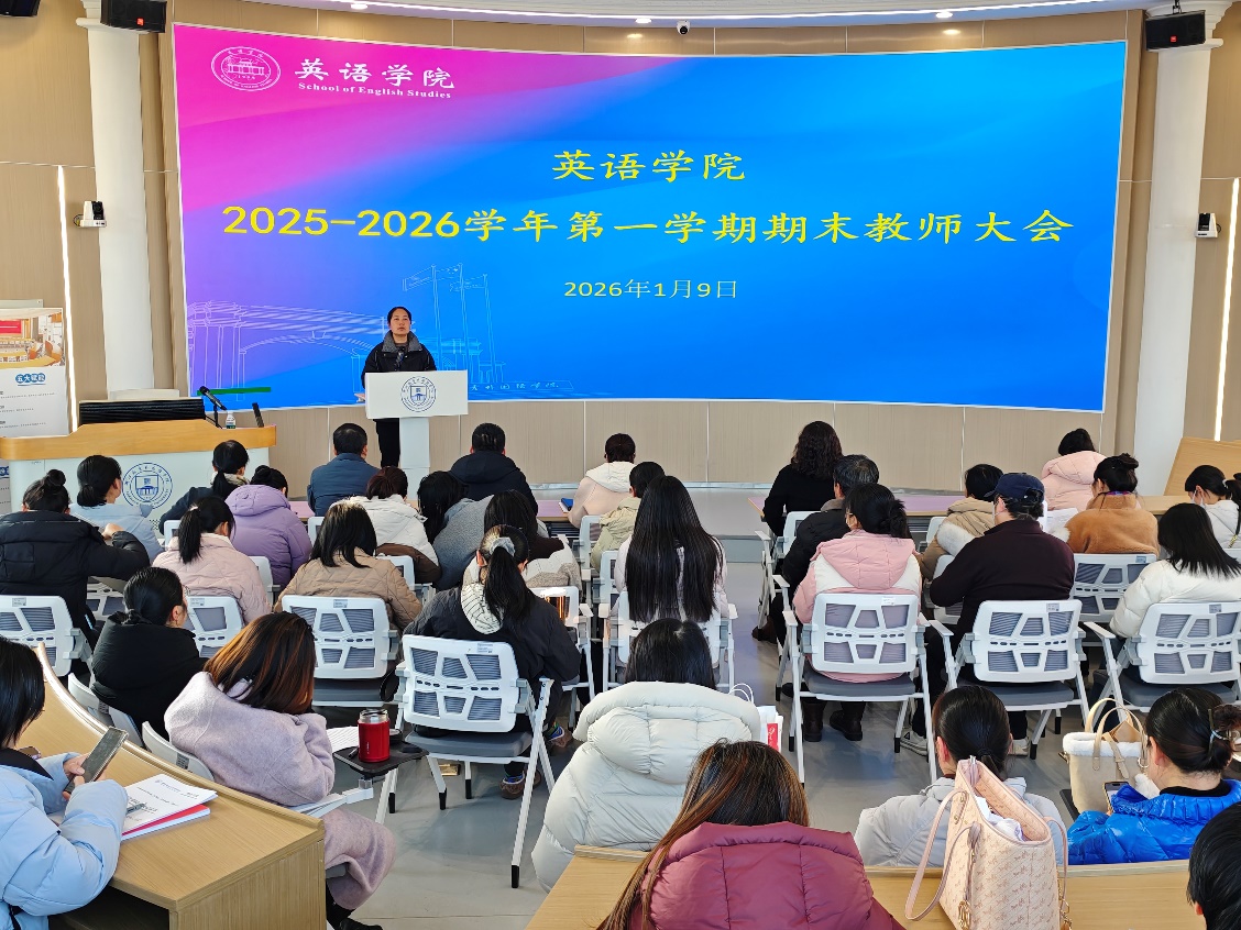 2026年1月9日下午,英语学院于圆顶报告厅召开2025-2026学年第一学期期末教师大会,全体院领导及教职工参会,会议由李敏书记主持。