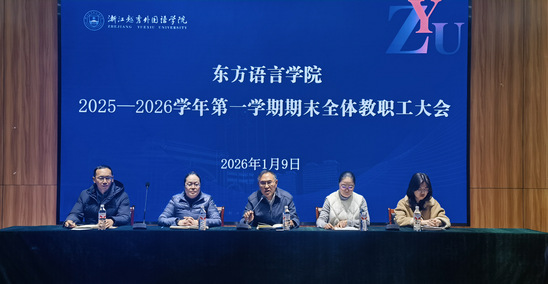 1月9日下午,东方语言学院召开2025-2026学年第一学期期末全体教职工大会。学院党政领导及全院教职工参加会议,会议由邱鸣院长主持。