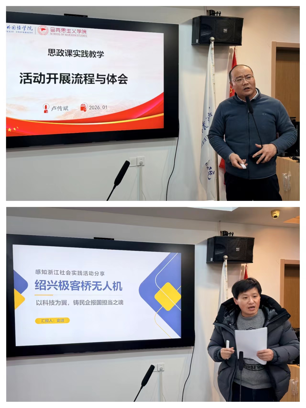 在实践教学经验交流环节,史进、卢传斌两位老师先后生动讲述了“感知浙江”实践教学活动的组织历程与丰硕成果。他们结合学生的实践案例,展现了实践教学在提升学生综合素质、深化理论应用能力方面的重要作用,为后续实践课程创新提供了鲜活样本。
