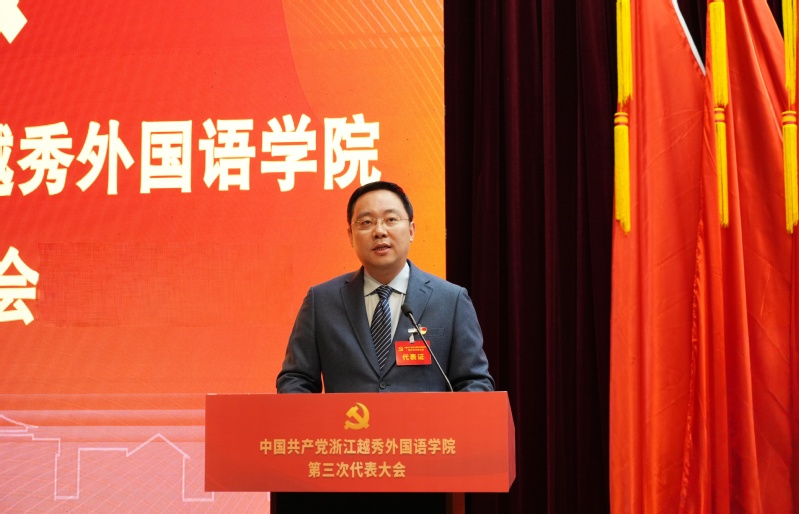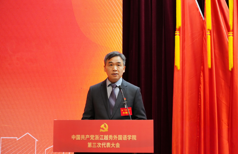学校党委书记罗继红代表中国共产党浙江越秀外国语学院第二届委员会向大会作题为《笃行实干开新局 踔厉奋发创一流 为加快建设中国一流应用型、融通性、国际化民办品牌大学而不懈奋斗》的工作报告。